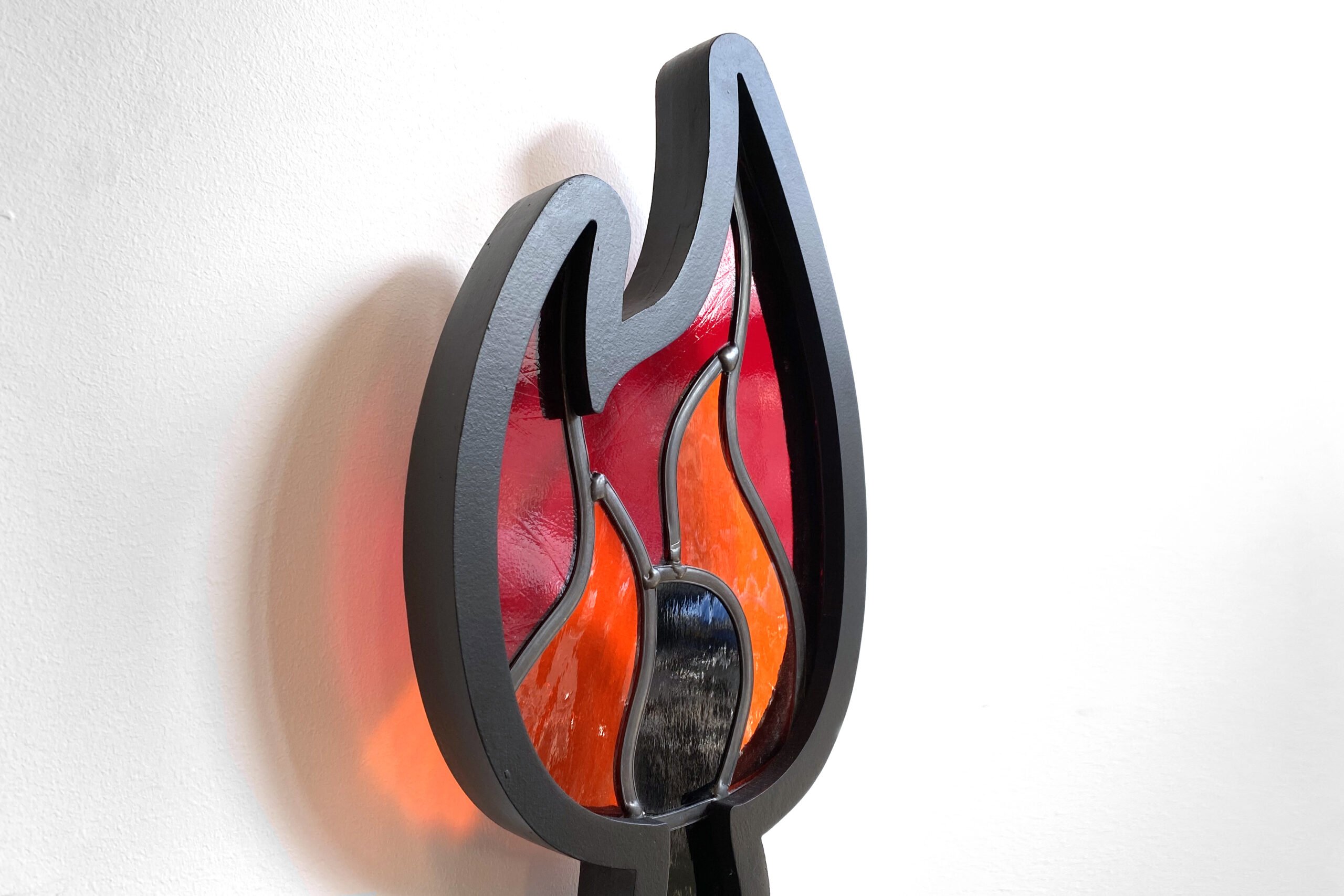 Handgemaakt glas-in-lood wandobject met zwart houten frame.
