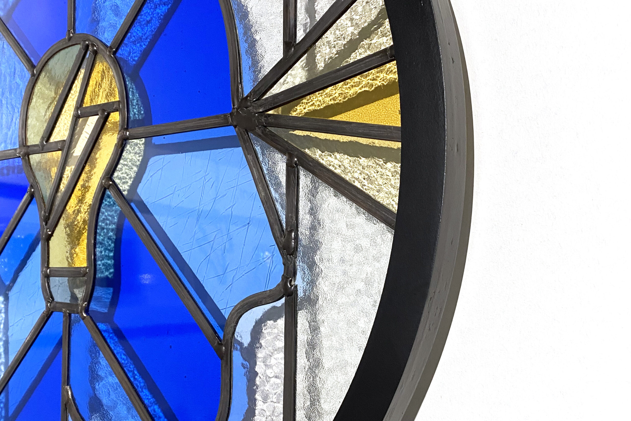 The stained glass work “The Spark of Insight” captures the moment of inspiration, when an idea or insight suddenly becomes clear.