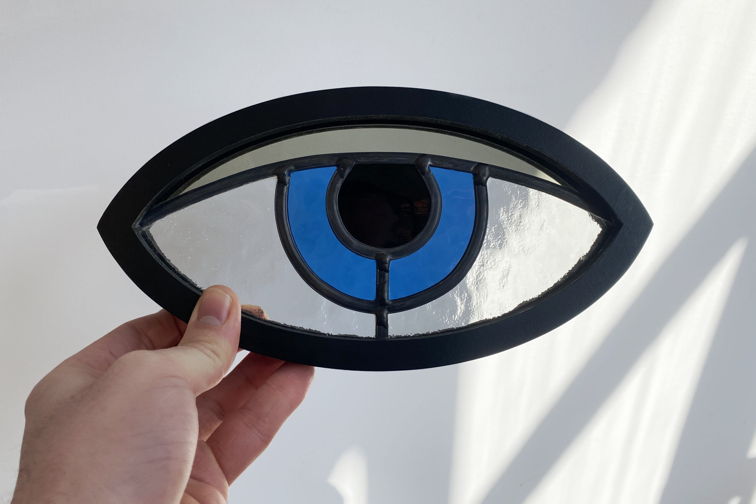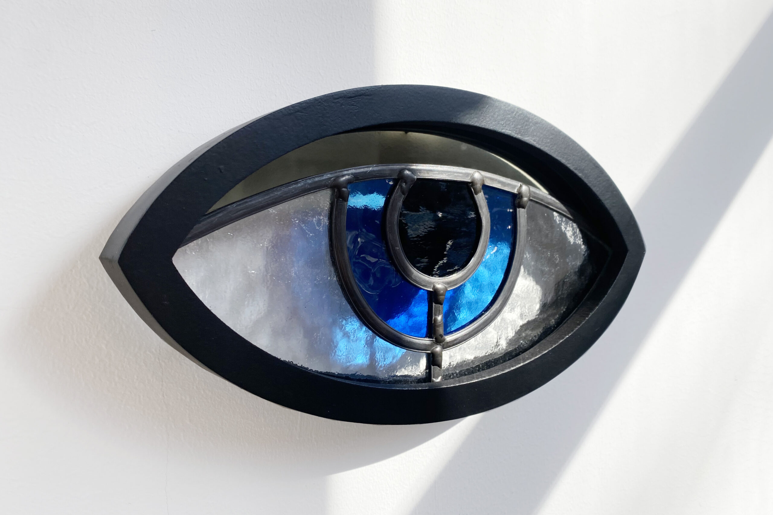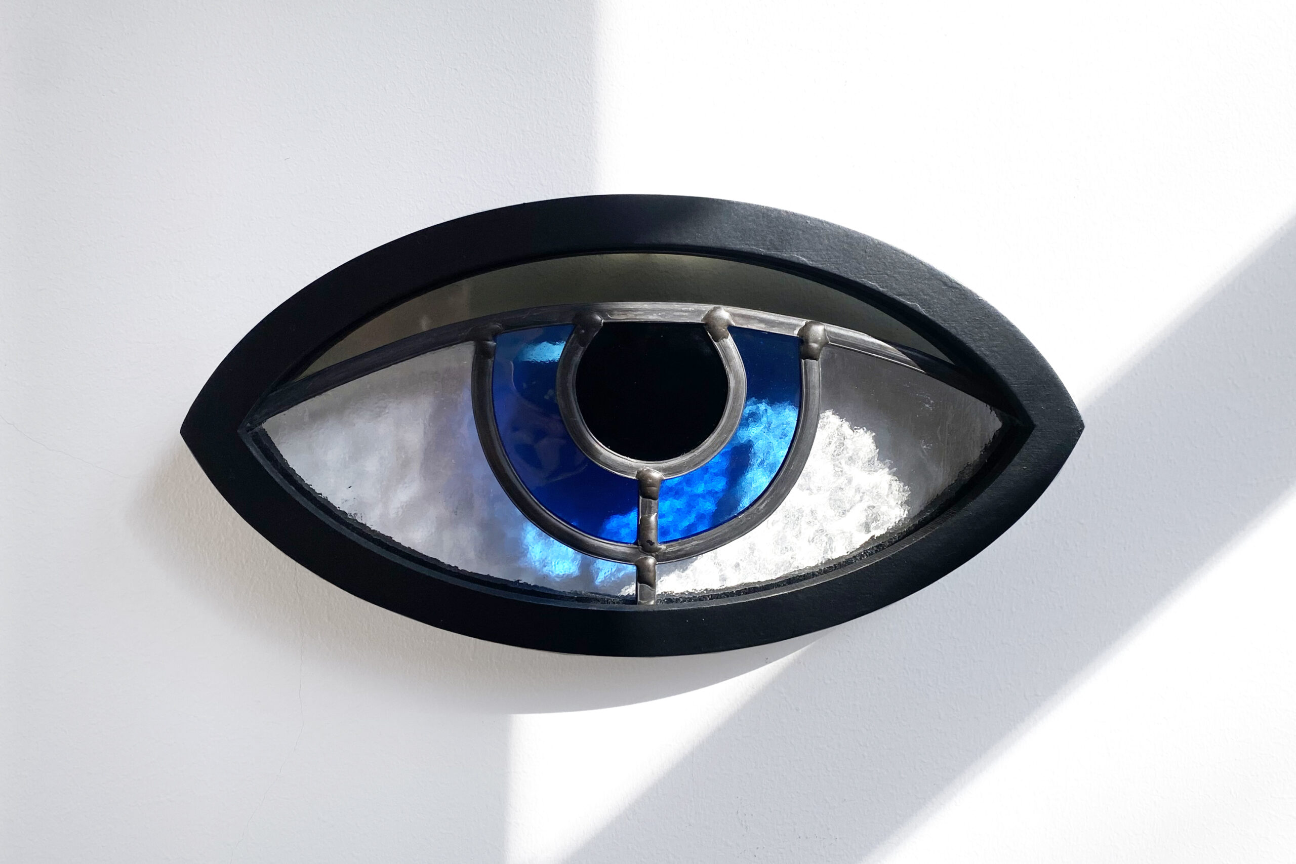 Handgemaakt glas-in-lood wandobject met zwart houten frame.