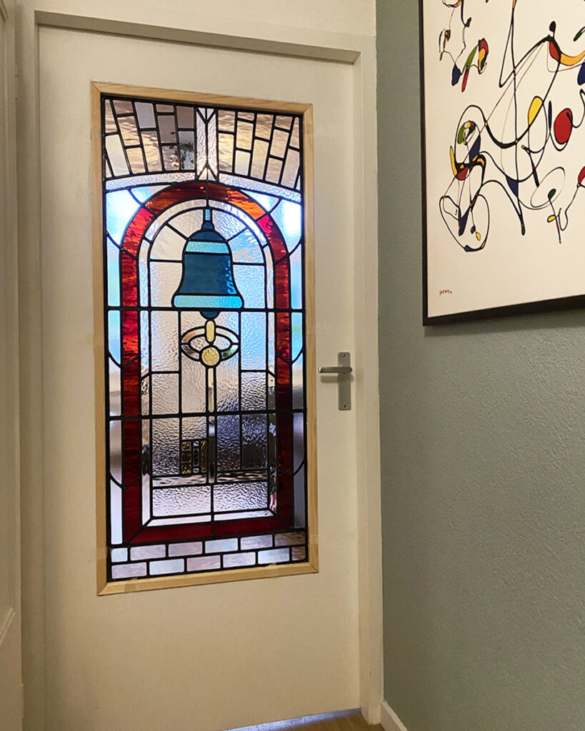 Ik kreeg een verzoek van iemand die in de voormalige dekenfabriek ‘De Blauwe Klok’ in Leiden woont. Ik kreeg alleen de opdracht om de blauwe klok te verwerken die op de gevel van het historische gebouw prijkt. Hiermee ging ik aan de slag in combinatie met een abstracte poort, klassieke kleuren en de Leidse sleutel (die verwijst naar het stadswapen van Leiden). Het glas in lood werk is geplaatst in een tussendeur van het huis.
