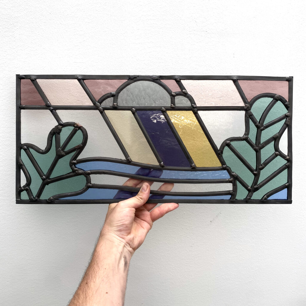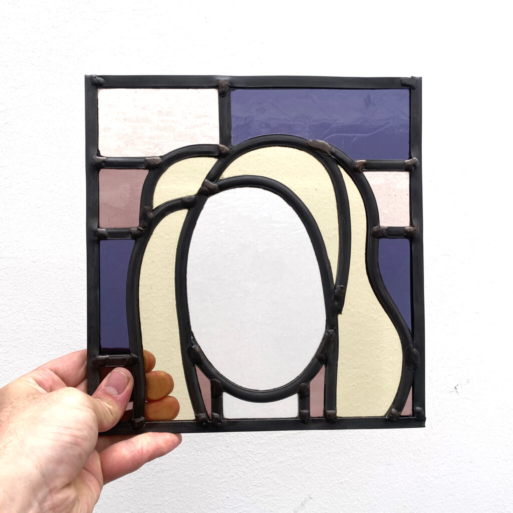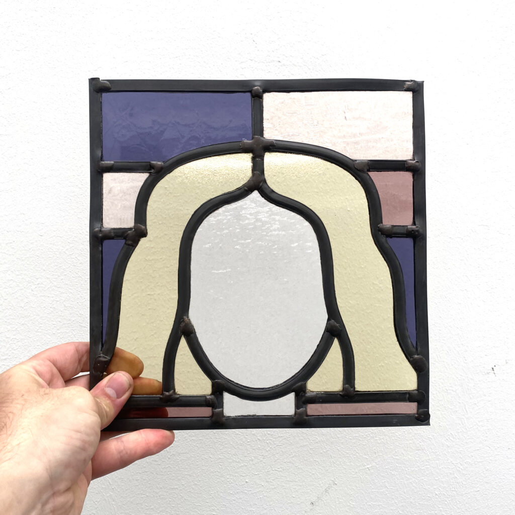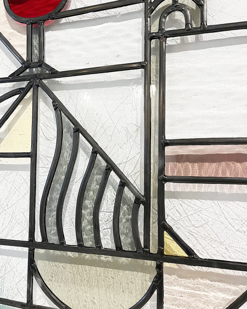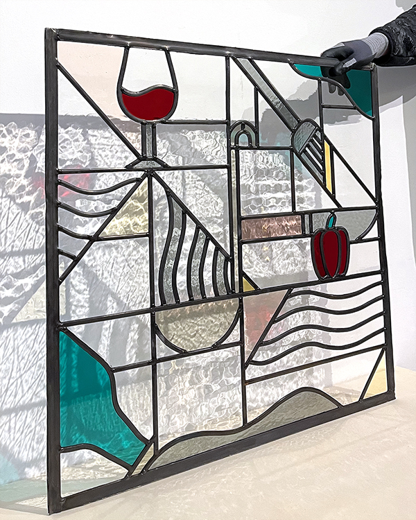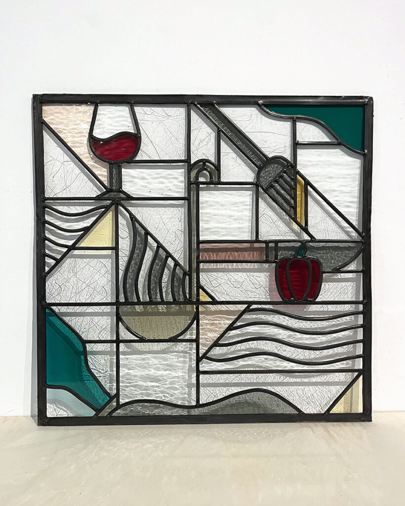 Dit glas-in-lood werk van 80 * 80 cm wordt in een muur geplaatst. Dit brengt meteen meer licht tussen hal en keuken.